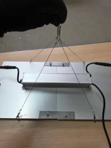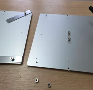Die zwei Muttern links vom rechten Panel entfernen. Muttern vom Rechten Panel an den Verbindern lösen damit sich die Halter schwenken lassen. Halter schwenken und einhaken. Muttern aufsetzen und alle vier festziehen.