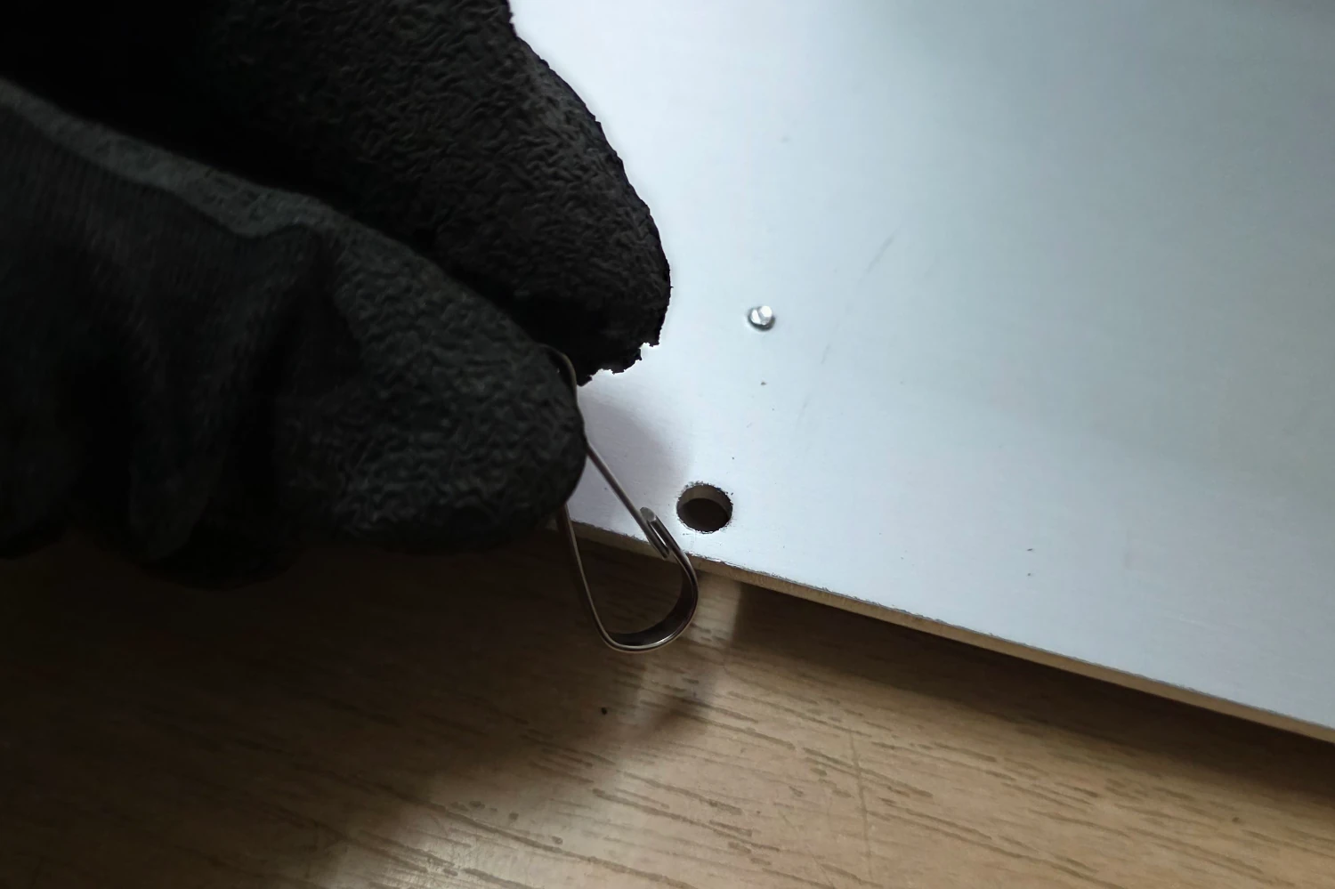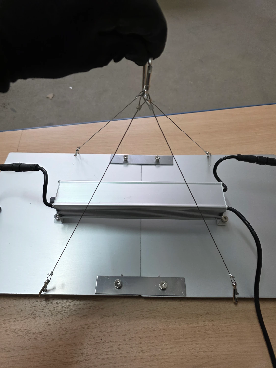 Haken mit Stahlseilen in die Löcher einhaken. Die Drahtschlaufen in den Karabiner einhaken.